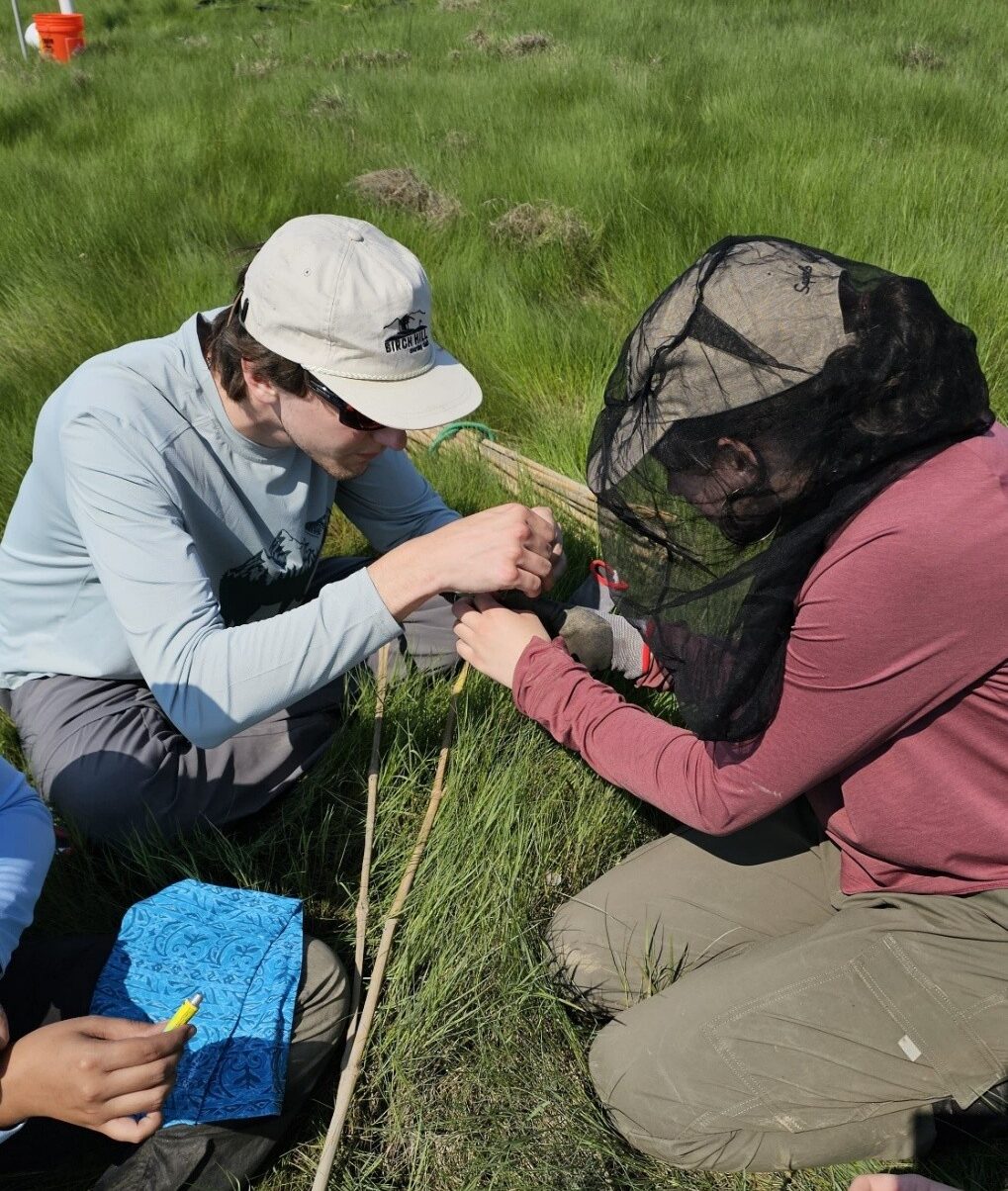 2025 REUs Colin Surdam and Anna Davidson tethering fiddler crabs. Photo by Valerie Acosta Rodriguez.