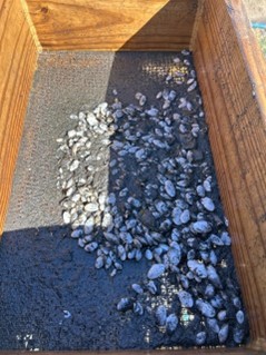 David Kimbro, Jon Grabowski, Wendi White, and Gillian Nichols from Northeastern University harvested and processed 14 clam recruitment boxes, which exclude most predators, during a long day on October 21, starting at sunrise. Box contents were sieved and clams and other macrofauna were preserved. Data from these boxes, together with data from a mid-season harvest by REU Lindsey Davis (see August newsletter) will help answer questions about soft-shell clam recruitment in PIE estuaries, and whether poor recruitment or predation may be responsible for a decline in the fishery. (Look at what was in a single box! – what do you think?) Thanks to Hannah Orton for ferrying the team out to The Great Marsh Shellfish Company farm, and to Brenden Doyle and Lindsey Wishart for use of the site!