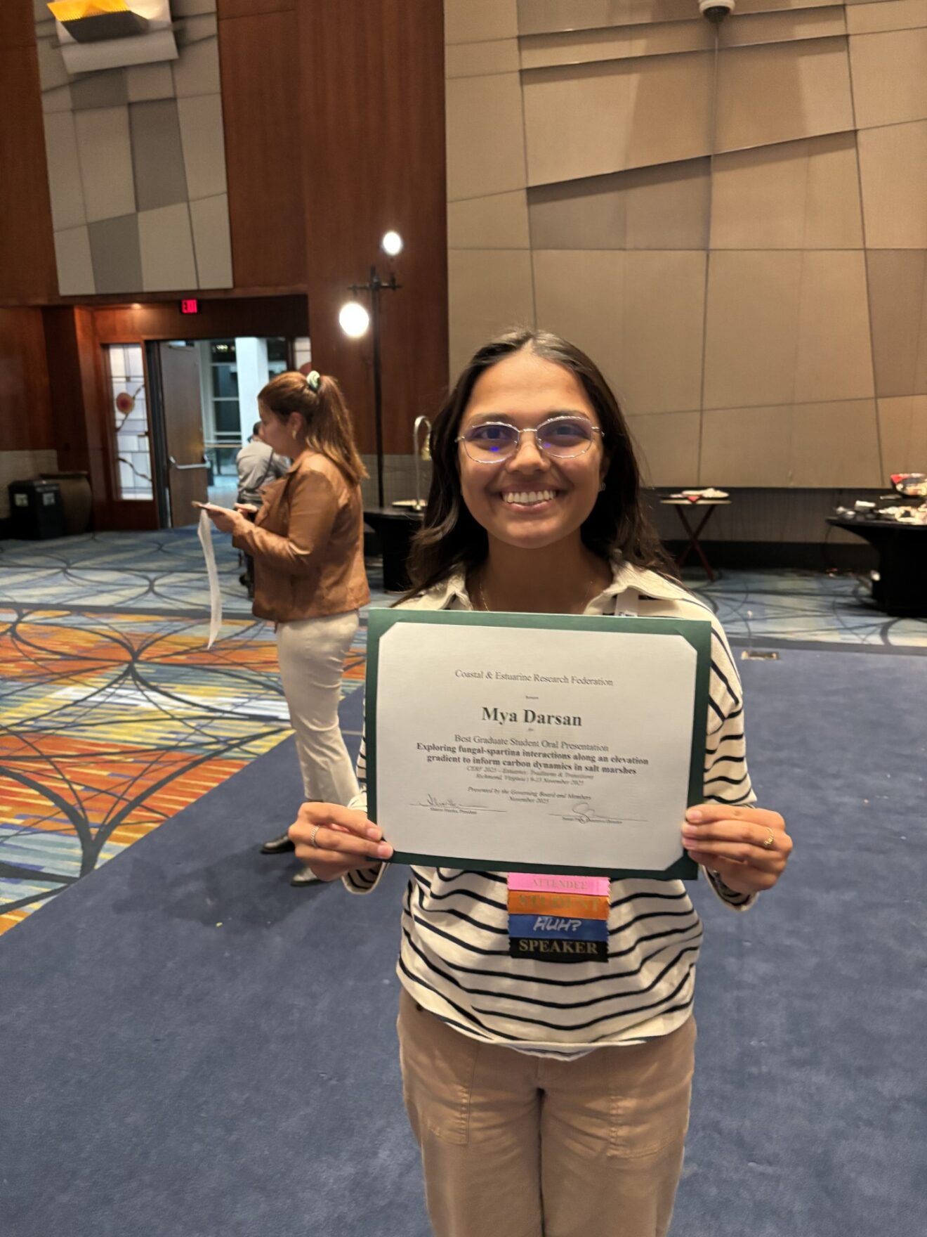 The PIE LTER and related projects had an amazing showing at the Coastal and Estuarine Research Federation (CERF) Biannual Conference last week in Richmond, Virginia. Several PIE researchers gave presentations showing off the breadth of research that we do here at PIE and Mya Darsan, our Graduate Student Representative, won an award for the best graduate student oral presentation.