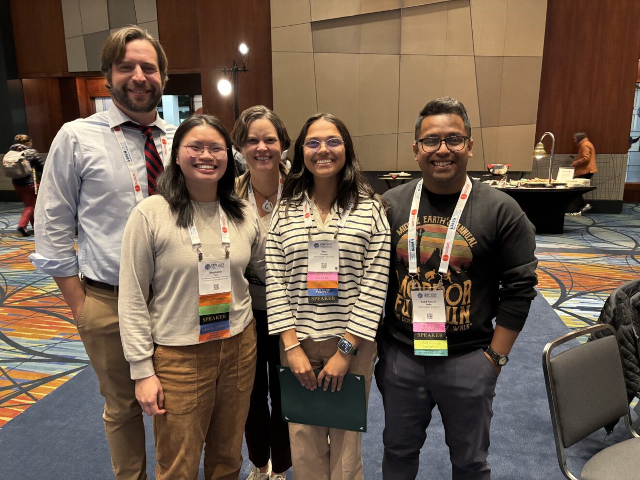 Below left to right: Lucia Ramirez-Joseph (UGA) presenting her poster; Matt Costa, Stephanie Tsui, Randall Hughes, Mya Darsan, and Sa'ad Rafie (Northeastern) at the awards ceremony; Sam Kelsey, Emma Rosser, and Nancy Yang (MBL) at the poster presentation.